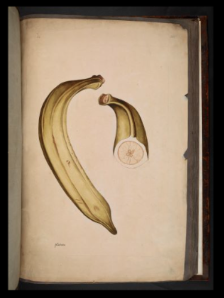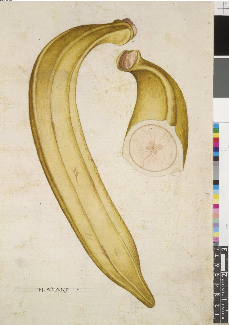I mentioned that the watercolour paintings of John White, early colonizer to America, are unclear, in that there’s a profusion and confusion of versions, copies, attempts. You can see here three version of a plantain, from three different surviving sources. The first is dated by the British Museum to between 1585 and 1593, and they credit it to John White: