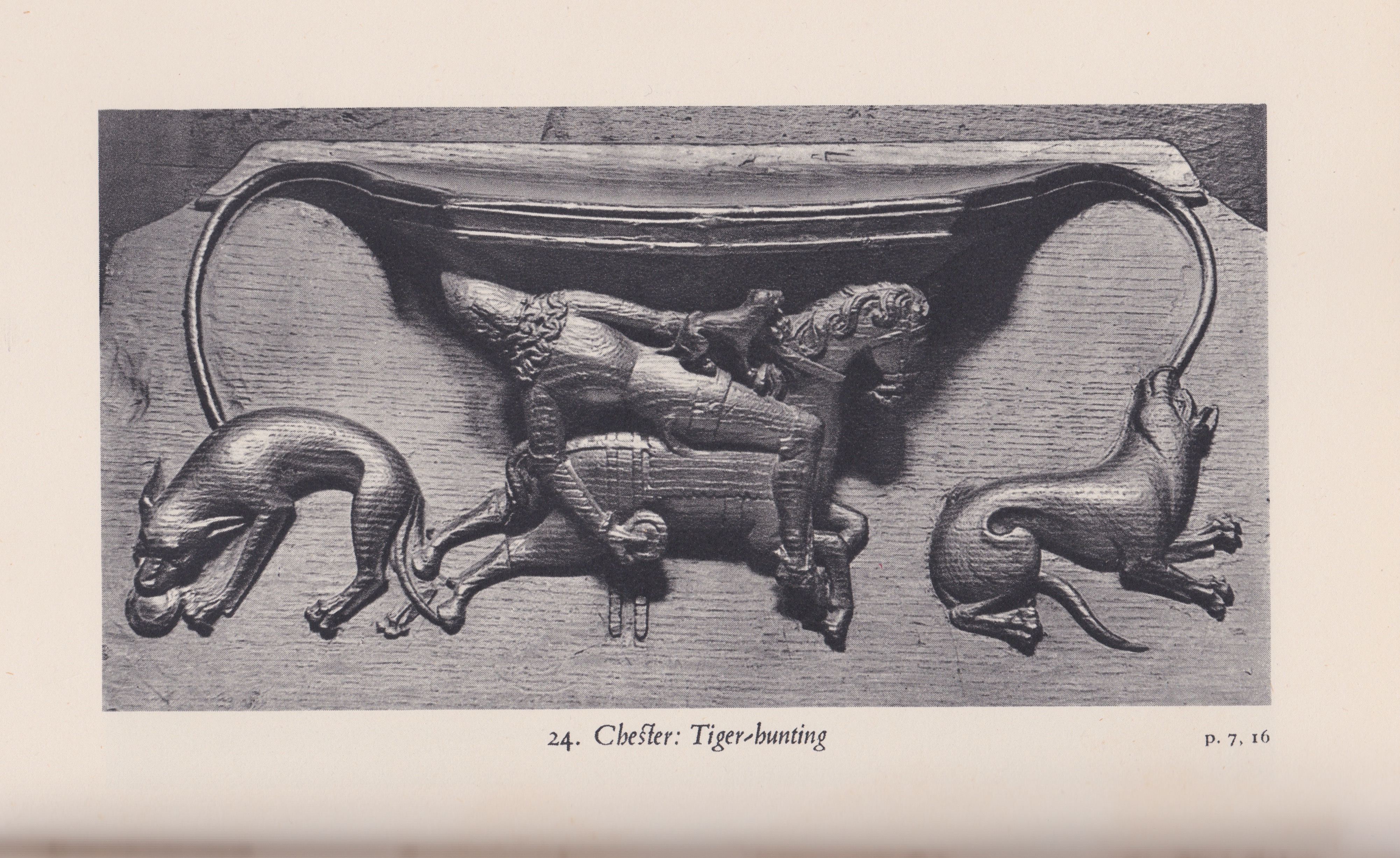 In Misericords: medieval life in English woodcarving by M. D. Anderson, King Penguin no. 72, 1954, here’s a hunter and tigers:
