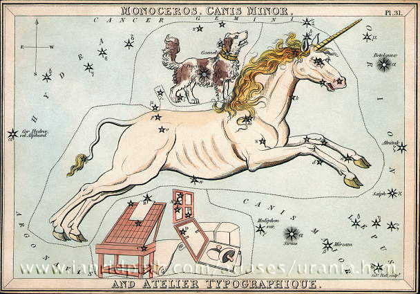 Astronomer Johann Bode is so taken by the equipment of the letter-printing press that in his Uranographia of 1801 he suggests immortalizing it as a constellation. Here it is, below the horse, in a hand-coloured version: