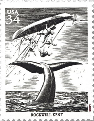 And here is a stamp issued by the US Postal Service in 2001, as part of the series celebrating American Illustrators (self-adhesive! 125 million stamps printed). It’s one of Rockwell Kent’s illustrations for the 1930 edition of Moby-Dick. Though in this edition, this image is printed within chp 105, discussing ‘Does the Whale’s Magnitude Diminish? – Will He Perish?’, it’s an image of a boat becoming wreckage. There is one member of the crew, at the end of the book, who will find something among the wreckage to cling on to: Ishmael uses Queequeg’s hand-carved coffin as a surfboard, to take him safely towards shore.