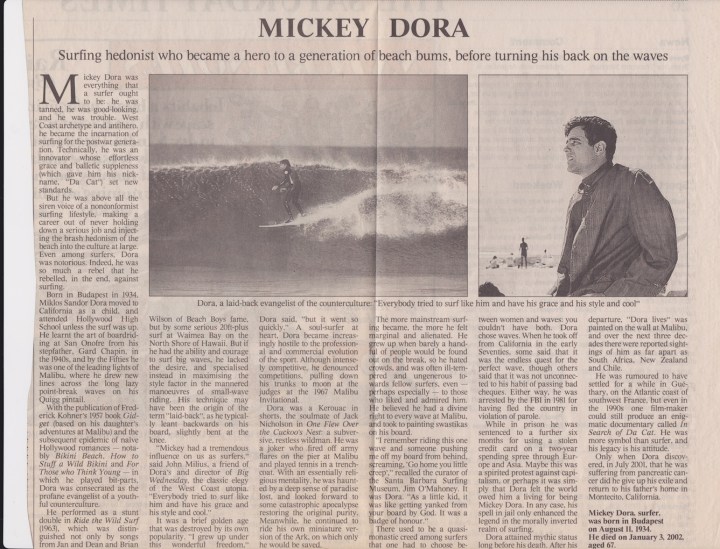 Here’s what Martin says about surfer Mickey Dora: “With an essentially religious mentality, he was haunted by a deep sense of paradise lost, and looked forward to some catastrophic apocalypse restoring the original purity. Meanwhile, he continued to ride his own miniature version of the Ark, on which only he would be saved.”